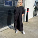 Emma is a maxi dress with a round neck, slightly dropped shoulders and slash pockets. It has an oversized fit & wide skirt.