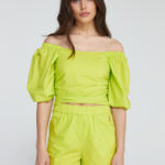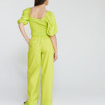 De elastische stof aan de achterzijde zorgt ervoor dat hij goed aansluit rondom je taille. Rondom de hals en schouders is de top ook voorzien van elastiek, waardoor je gemakkelijk kunt kiezen of je de top off-shoulder draagt of op de schouders. Daarnaast geven de pofmouwen een speelse en elegante touch. Combineer de top met de YANA pants voor ‘a pop of lime’! “