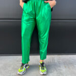 Made in the prettiest shiny metallic green. The pants have an elastic waistband and slash pockets.