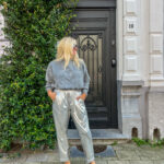 Made in the prettiest shiny metallic silver. The pants have an elastic waistband and slash pockets.