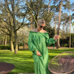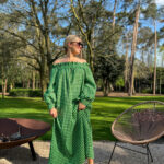 Maxi off-shoulder dress in checked green. Made from an airy seersucker fabric. Ruffled details on the shoulder. Cute bows on the sleeves.