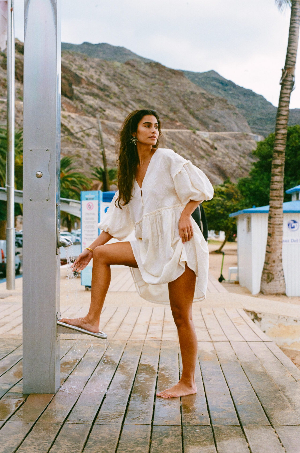 “Dream away in our YARA dress! De YARA jurk heeft een oversized balloon fit met pofmouwen. Aan de voorzijde heeft de jurk een subtiele v-hals met daaronder 3 knoopjes. Rondom de taille zit een kleine ruche, little cuteness! De overall schelpen print is een ‘magical escape’. “